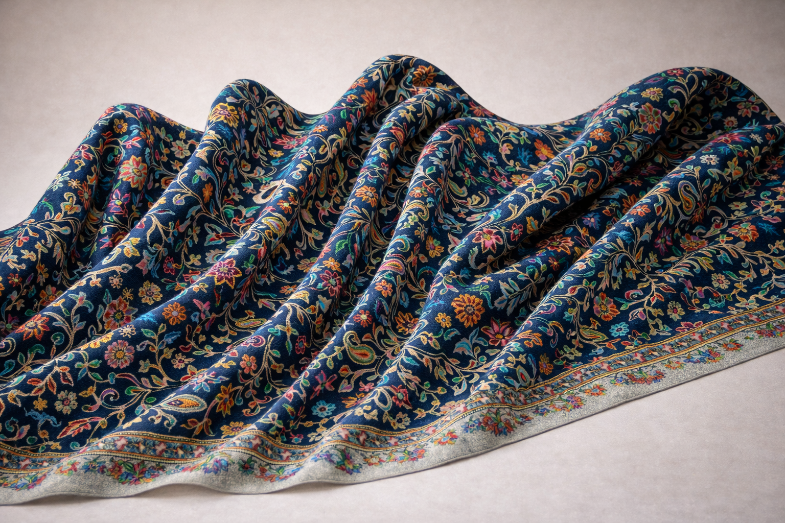 The Kani shawl is a masterpiece of Kashmiri weaving, known for its intricate patterns and exceptional craftsmanship. Unlike embroidered shawls, Kani shawls are woven using small wooden bobbins called “kanis,” allowing detailed motifs to emerge directly from the loom. Inspired by Mughal artistry and nature’s beauty, these shawls often feature elaborate paisley and floral designs. The weaving process is painstaking and can take months to complete, reflecting dedication, patience, and unmatched skill.